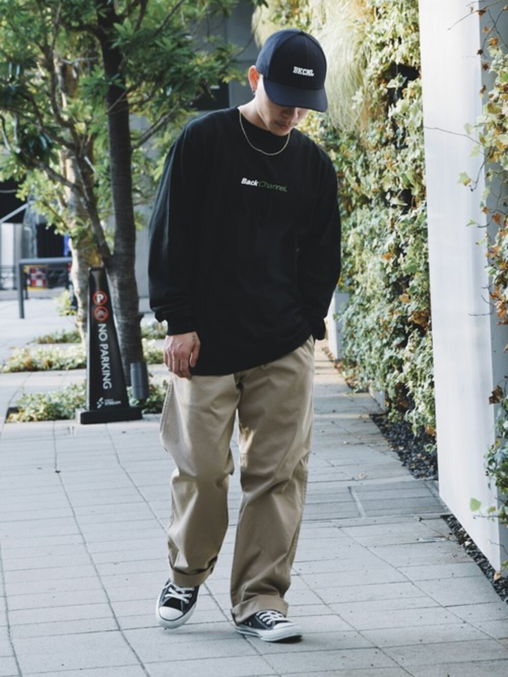 印象的なバックプリントが特徴のロンTにゆったりとしたチノパンを合わせたクラシックなストリートスタイル。