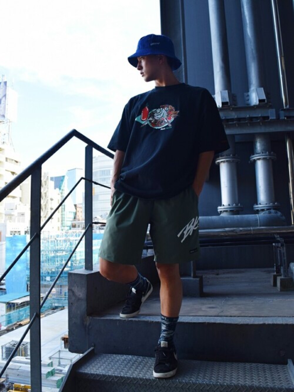 存在感のあるモチーフのプリントTシャツに機能素材ショーツを合わせたコーディネート。