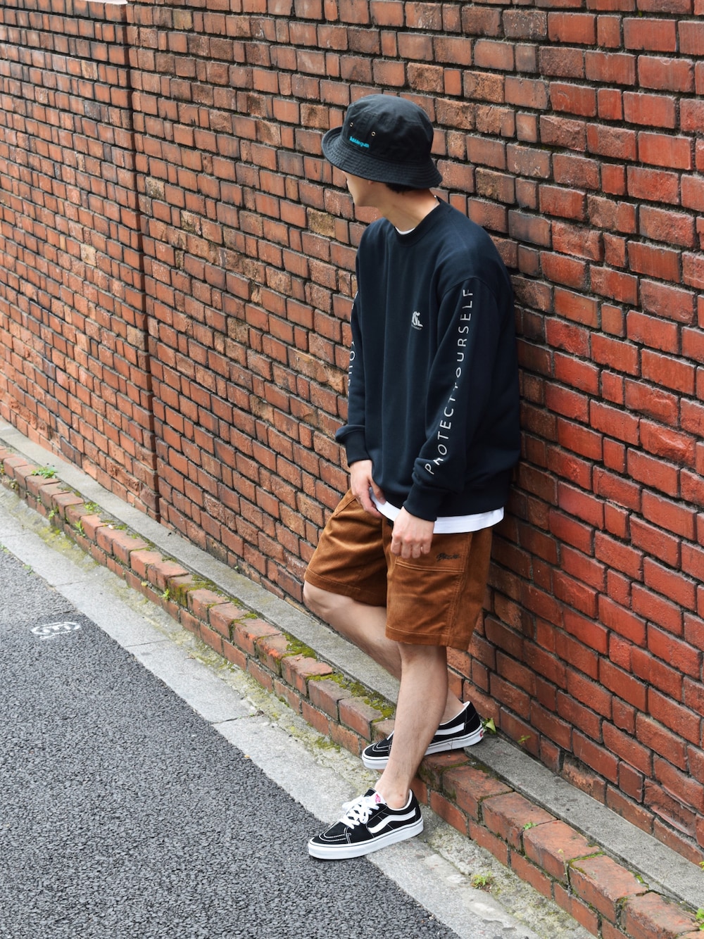 ヘビーオンスでタフな質感のコーデュロイショーツを使ったコーディネート。