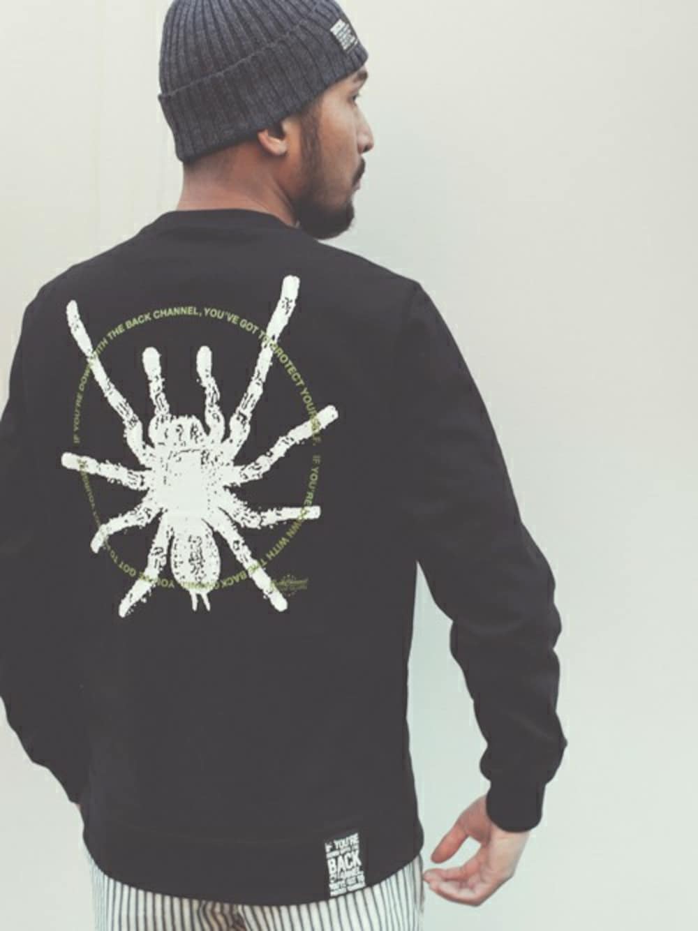スパイダーのプリントが印象的なスウェットにリネン混のコットンを使用したリブ編みのワッチキャップ。 ストライプのチノパンツが程よくアクセントに。シンプルな組み合わせだけにサイズ感が肝。
