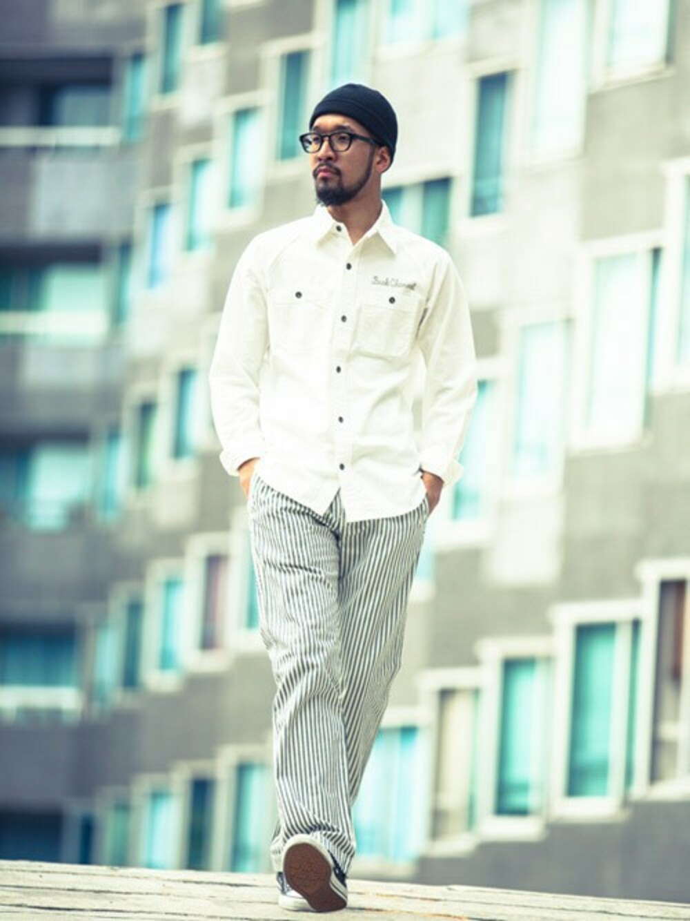 清潔感あるシャンブレーシャツにストライプのチノパンツに通気性に優れたサーマル素材のビーニーキャップの シンプルな組み合わせ。シンプルな組み合わせだけにサイズ感が肝。