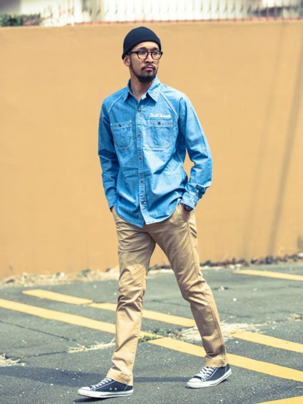爽やかなブルーのシャンブレーシャツにストレッチ素材のスキニーチノパンツ。 通気性に優れたサーマル素材のビーニーキャップを合わせすっきりさせたコーディネート。