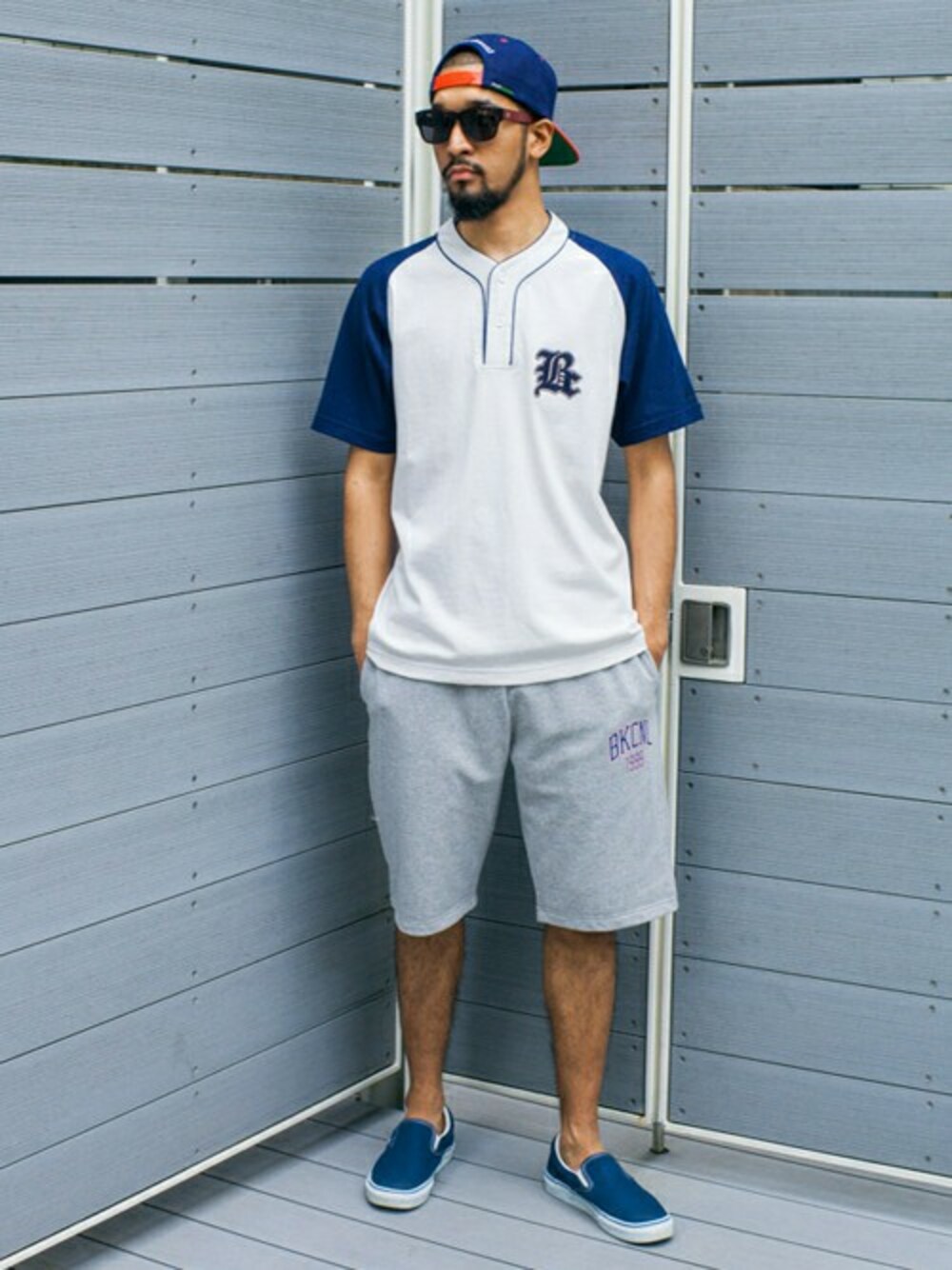 オールドイングリッシュのワッペンがポイントのベースボールTシャツにスウェットショーツ。 スナップバックを合わせたスポーツスタイル。