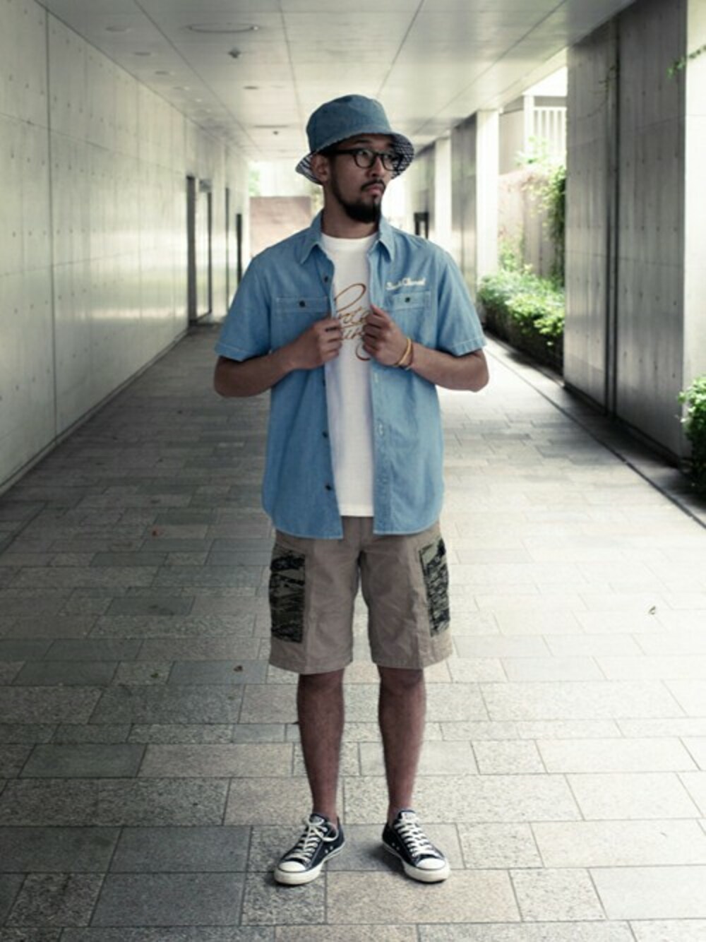 胸にチェーン刺繍のブランドロゴが施されたシャンブレーシャツとゴーストライオンカモがプリントされた生地を部分使いしたカーゴパンツの組み合わせ。 ワークテイストなスタイルを演出し、ブレスレットをアクセントに。