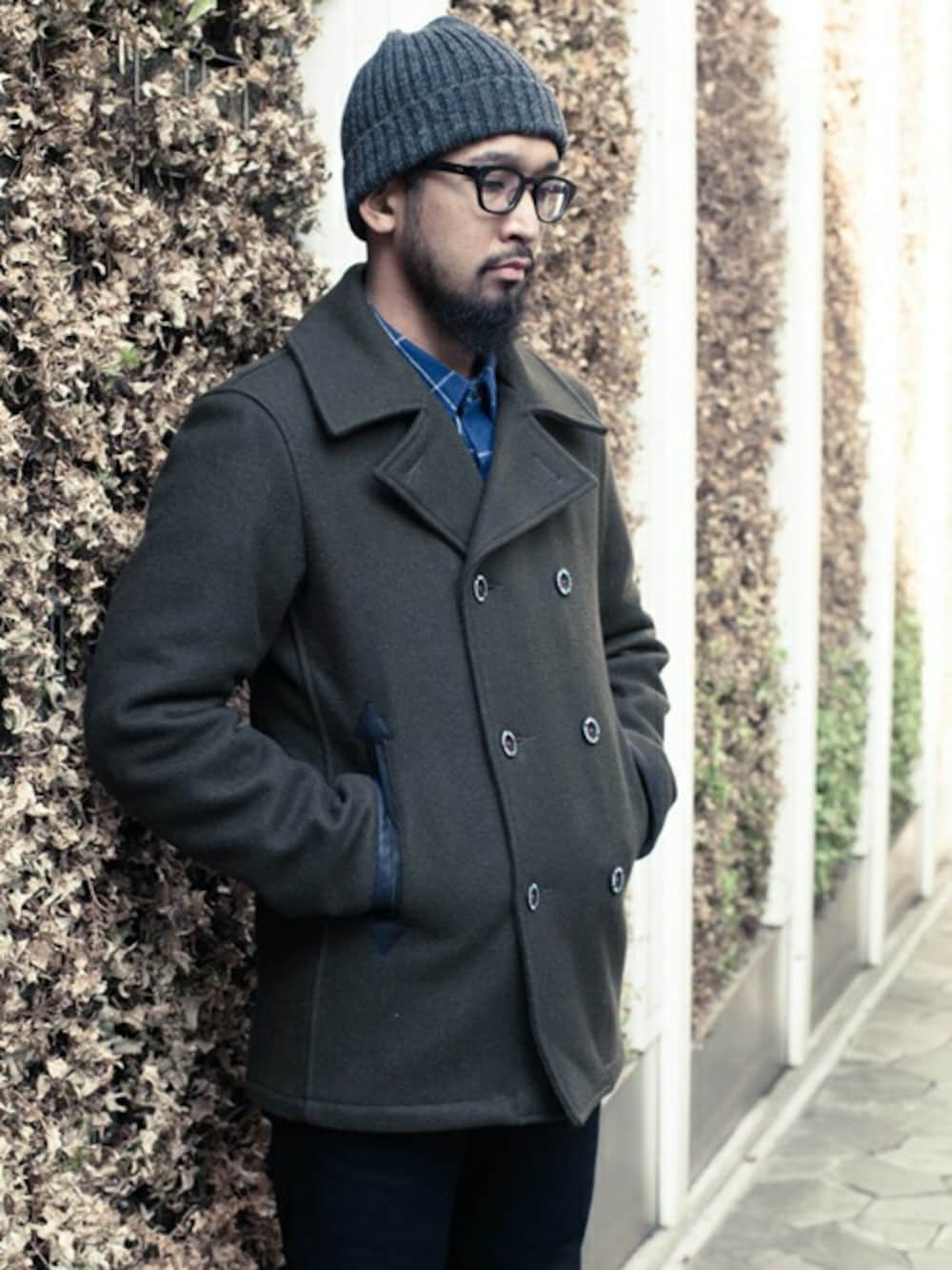 カナダの老舗ブランケットメーカー"VICTOR WOOLENS"のメルトンを使用した肉厚なPコート、インナーのネルシャツに イギリスのシェットランドウールを使用したニットキャップ。ウール素材のアイテムでまとめた冬仕様のコーディネート。