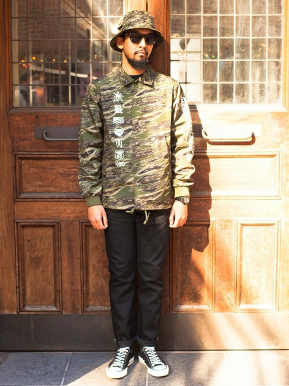 水を弾く防水透湿素材に、オリジナルテキスタイルである【ゴーストライオンカモ】がプリントされたウィンドブレーカー。 ボトムスとスニーカーをブラックでまとめ、旬なミリタリーテイストを加えたコーディネート。