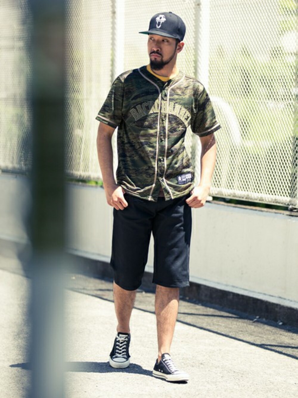 通気性に優れたメッシュ素材にゴーストライオンカモがプリントされたベースボールシャツ。 ストレッチ素材を採用したデニムショーツを合わせ、機能性も考慮したコーディネートに。