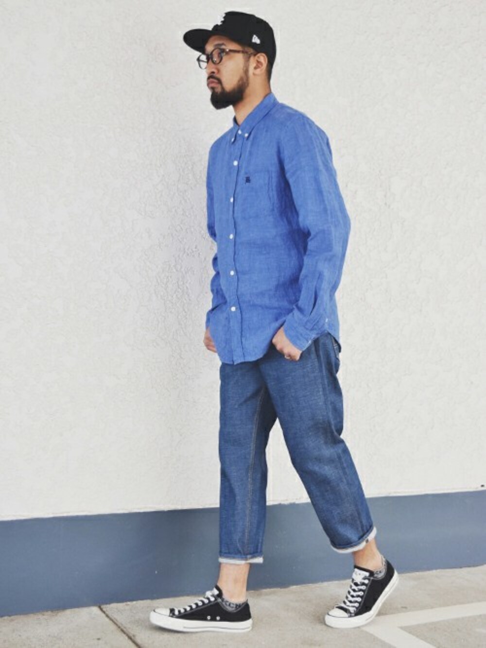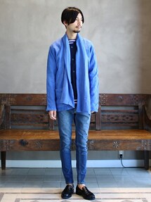 肌触りの良いリネン素材を使用したシャツに、ストレッチ素材を使用した9分丈のデニム。 NEW ERA社別注のキャップを組み合わせた、カジュアルなコーディネート。
