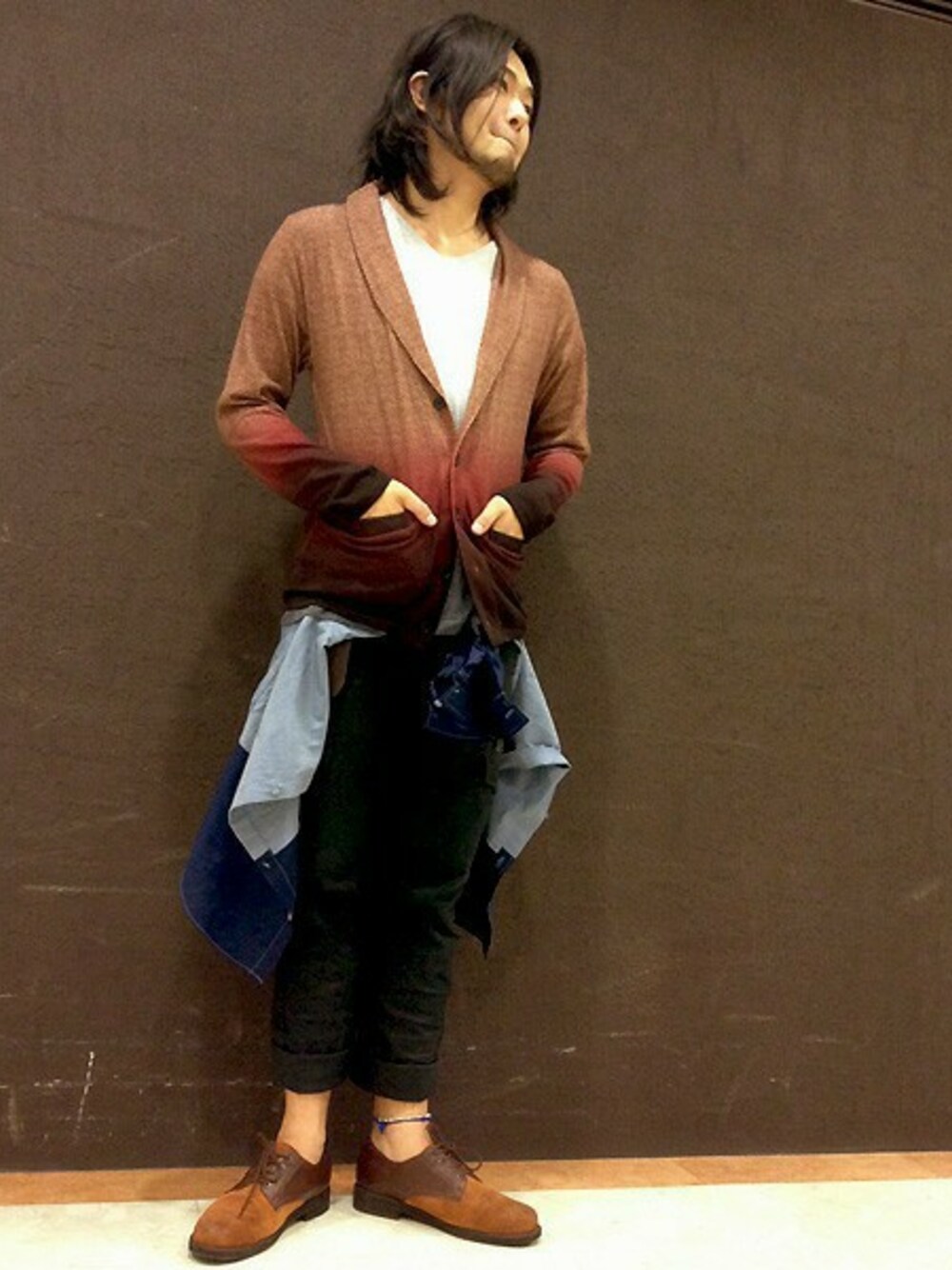 名古屋パルコ店セッティングクラックスの増田です。気温も徐々に下がっていく中、秋らしいボルドーカラーのグラデーションカーディガンとバイカラーのシャツをご紹介します。ショールカラーが大人の落ち着きがあり、この秋の一押しアイテムです。また腰にはトレンドのバイカラーシャツでラフなアクセントを取り入れてみました。