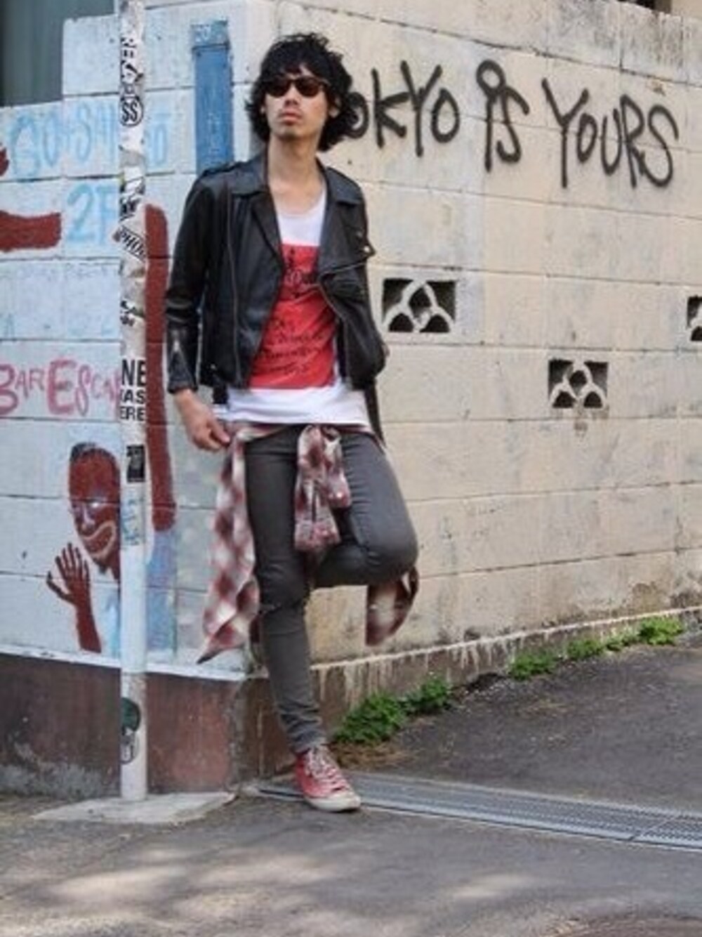 Leather Blouson:Vintage Sungrass:Ray-Ban T Shirts:used(New York Dolls) Check Shirts:Lanerossi 70's Skinny pants:Cheap Monday Sneaker:CONVERSE NY PUNK