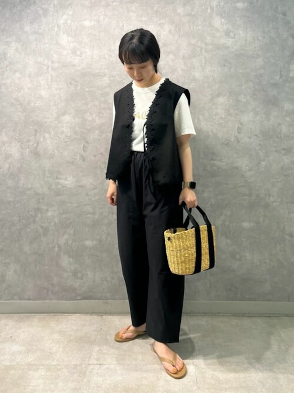 【サイズ感】 Tシャツ:標準 ベスト:ゆったり パンツ:ゆったり 【スタイリングポイント】 フラワーレースで縁取られたeunoiaのベストはシンプルなコーディネートのアクセントに◎ Tシャツのロゴと小物の色味を合わせて統一感を出しました。