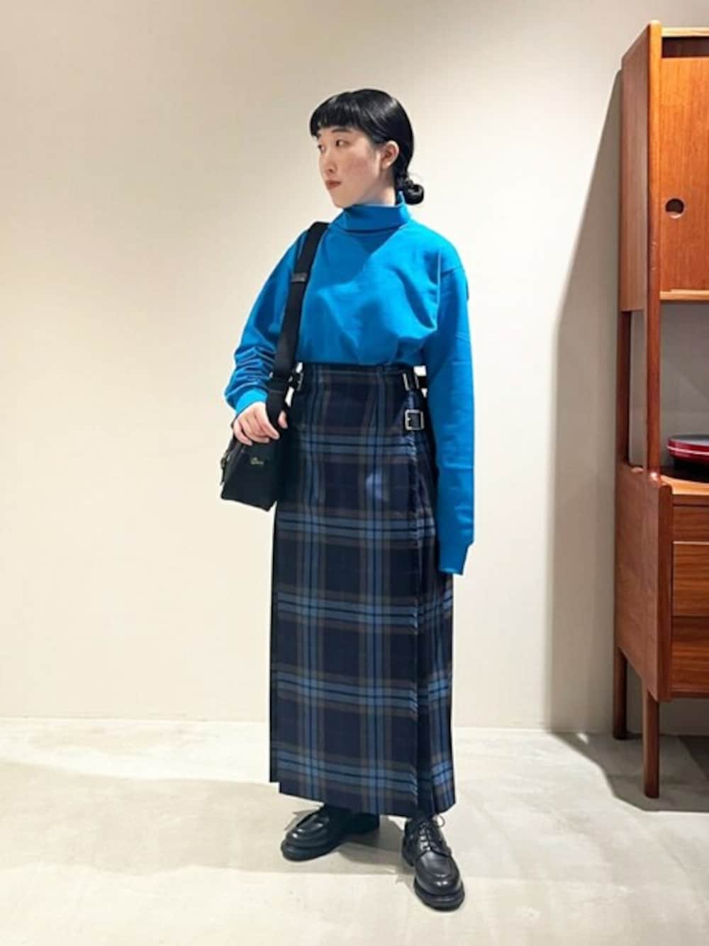 【サイズ感】 カットソー:袖丈・着丈長め スカート:ウエスト周りはタイト、長め バッグ:軽い 【スタイリングポイント】 青と黒でまとめたコーディネート。世代を超えて受け継がれてきた伝統的なアイテムたちも、ビビッドなブルーを差し色にすれば一気に現代的な雰囲気に。 〈O'NEIL OF DUBLIN〉のマキシスカートは、身長155cm/サイズ8でフラットシューズも履ける長さ。〈DRESS〉のカットソーはメンズサイズですが、程よいゆるさが可愛いです。襟が立ち上がってくれるため、一枚着でも引き締まります○
