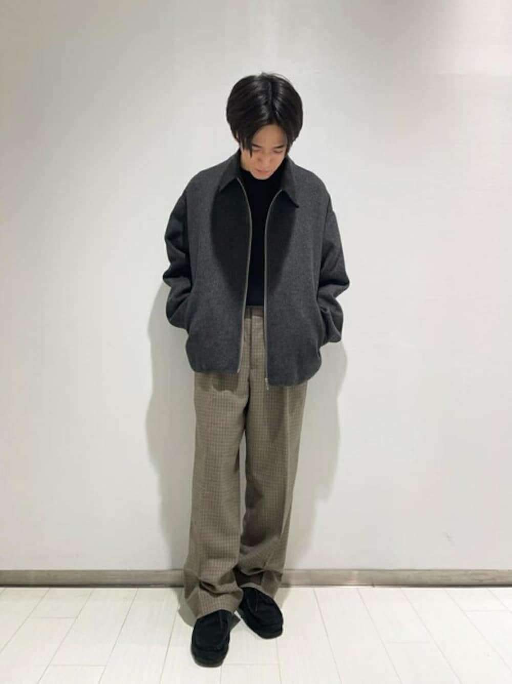 【サイズ感】 アウター サイズ4 ゆったり ニット サイズ4ゆったり パンツ サイズ46 ゆったり 【スタイリングポイント】 ORCIVALブラックとグレーのモノトーンにTangentのチェックパンツで合わせたカジュアルながらも大人っぽいスタイリングです。