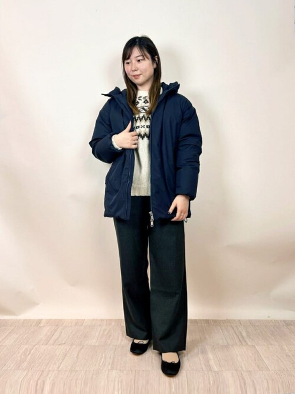 【サイズ感】 ダウン:ややジャスト ニット:ややゆったり ボトム:ジャスト 【スタイリングポイント】 ノルディック柄のニットはコーディネートのアクセントにもなります。ダウンはカジュアルな雰囲気になりがちですが、ボトムスを少し光沢のあるウールパンツで合わせたり、女性らしいシューズを合わせることによってカジュアルになり過ぎずに着用いただけます。 画像・動画設定