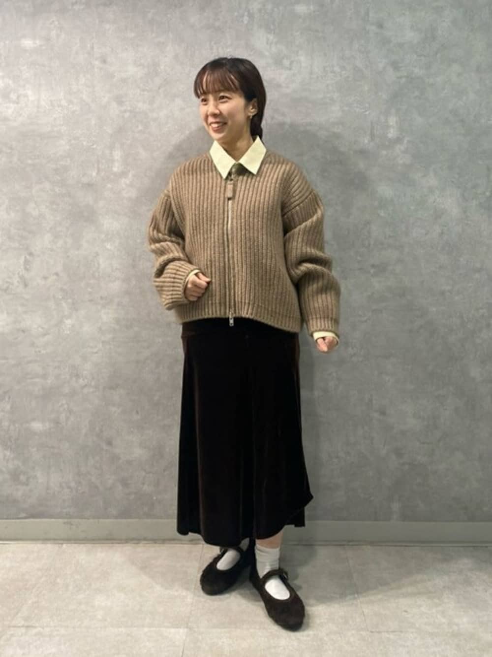 【サイズ感】 ニット:ゆったり スカート:標準 【スタイリングポイント】 unfilのニットブルゾンはたっぷりのカシミヤが使われており、抜群の暖かさと着心地です。着丈がすっきりしておりロングスカートやハイウエストのパンツなど相性が良さそうです。 drogheria Crivelliniのフェイクファーシューズはコーディネートのアクセントに◎