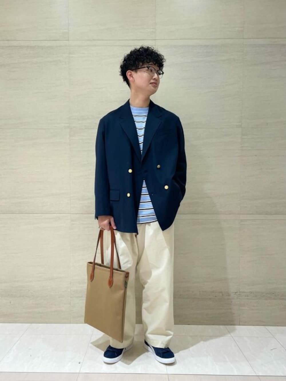 [サイズ感] ジャケット:ややゆったり トップス:ややゆったり ボトムス:ゆったり、ワイド シューズ:細め [スタイリングポイント] 今回は[Gymphlex]の紺ブレをワイドパンツでカジュアルに合わせてみました。 毎年定番のこの紺ブレは袖裏がストライプになっており、袖捲りをしてもとても様になるようにできております。スラックスと合わせて綺麗めにも、カーゴパンツと合わせて渋さも出せる万能アイテムです。 インナーは今年から取り扱いがスタートした日本のブランド[RYETENDER]のコットンニット。アップサイクルの取り組みが素晴らしく、着心地も良く、縫製も丁寧で、とても惹かれるブランドです。 バッグは[Brady]の新作FALという形です。シンプルな見た目ながら、持ち手はしっかり革、内側には小さめなポケットも付いており、上品に使いやすいです。