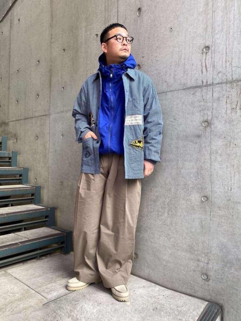 【サイズ感】 ジャケット:ジャスト ナイロンパーカー:ややゆったり Tシャツ:ゆったり パンツ:太め股上深め 【スタイリングポイント】 ワーク感のあるアイテムにスポーティーなナイロンパーカーをあえてインナーに使ってみました。
