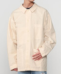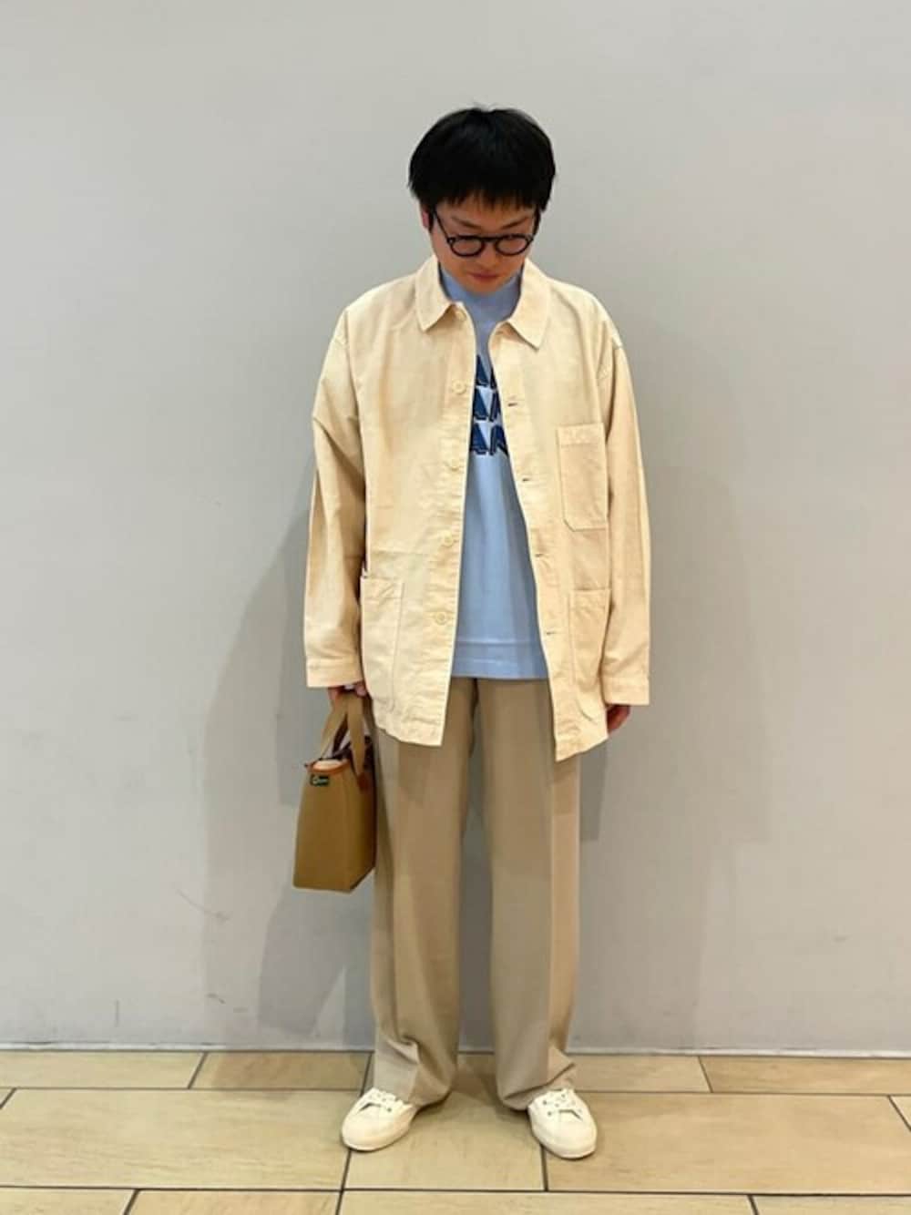 別注のblurhmsROOTSTOCKの別注Tシャツを差し色にワントーンでまとめました。 どんなスタイルにも合うVETRAのコットンリネンカバーオールを羽織り、パンツはCellar Doorのイージースラックスをチョイス。 綺麗なシルエットでありながらも、ゴムウエストのイージーな仕様。 シューズはSTUDIO NICHOLSONのキャンパスシューズを。 バッグはBradyのBECKで上品さをプラス。