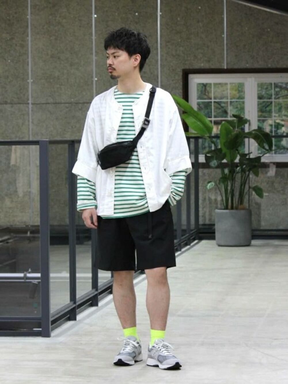 定番のバスクシャツをベースボールシャツとレイヤードさせたスポーティーなスタイリングを組みました。 〈PORTER CLASSIC〉のベースボールシャツはかなりオーバーサイズで、リラックスした雰囲気が特徴。 インナー次第でストリートな空気感や可愛らしさを演出してくれる、今の時期に着たい羽織もの。 また、最高級のスピンコットンを贅沢に使ったガーゼ素材は抜群の肌触りです。 〈GRAMICCI〉のショーツはBshop別注。 薄手のコーデュラナイロンを使用しており、ストレッチが効いているのでストレスフリーな履き心地。 裾口も広いので、これからの季節に快適に履いていただけます。