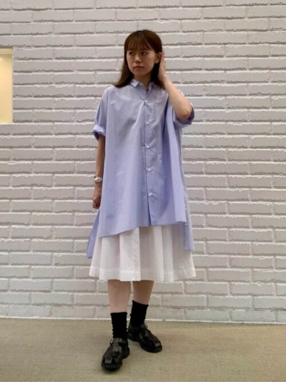 深めのサイドスリットがとても可愛いシャツにミモレ丈スカートを合わせて涼しげなコーディネートを意識しました。 シャツは袖を折って着ていただくのも可愛くておすすめです!