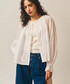 首元にギャザーが入ったフェミニンなトップスに太めのデニムを合わせることで、程よいカジュアルさを引き出してみました。 またトップスは丈が短めなため、低身長でもバランスよく着こなせることが嬉しいポイントです。