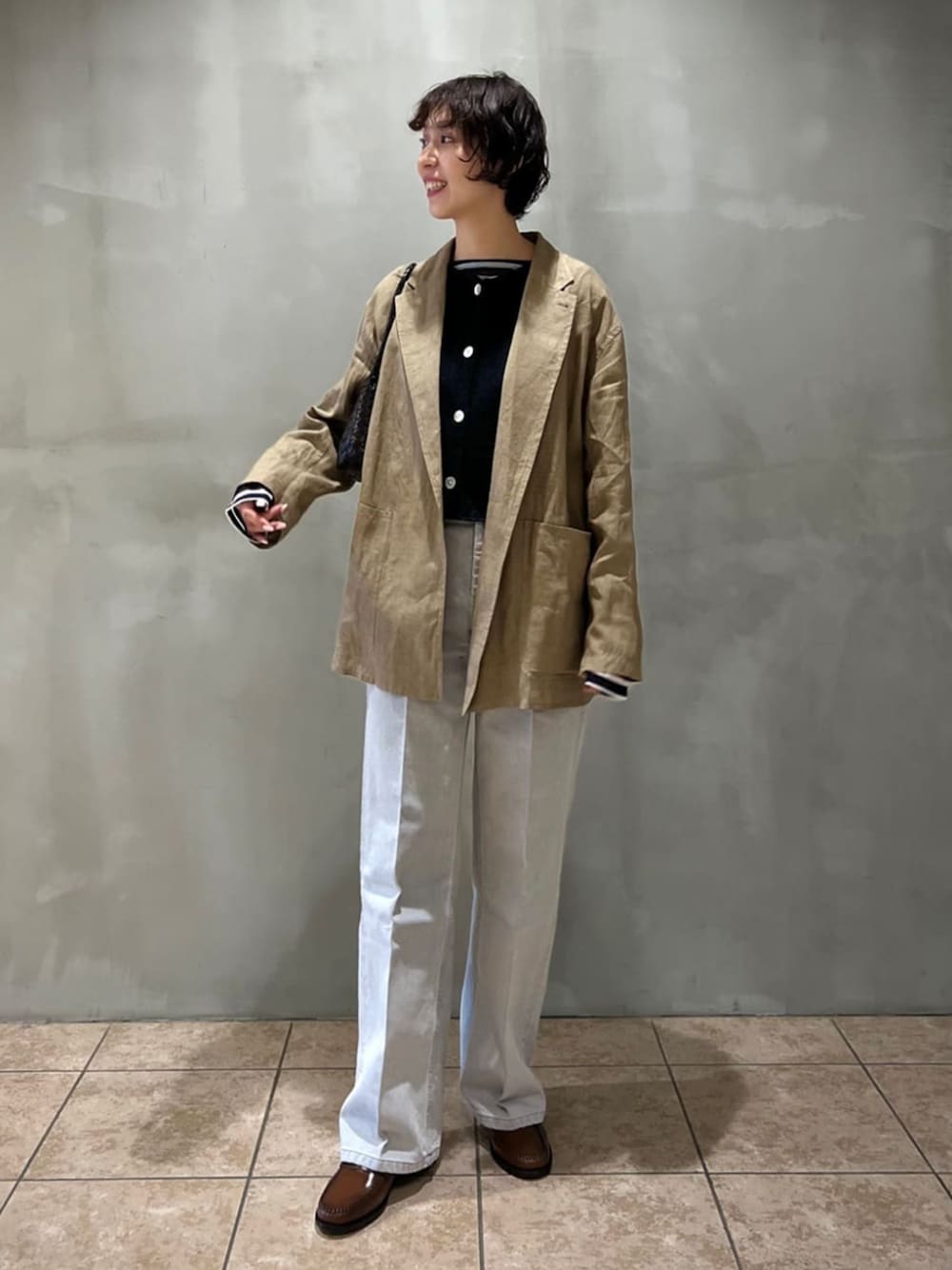【サイズ感】 Tops<ORCIVAL> :ややゆったり Tops<WALANCE>:標準 outer<YLEVE>:ややゆったり Bottoms <blurhms>:標準 Bag<dragon>: ONE Shoes<GH BASS>:7H / 24.5cm 【スタイリングポイント】 シアー感あるボーダー柄のカットソーとベストを重ね着して可愛いです。バランス的にゆとりのあるリネンポプリンジャケットを羽織ると個性的なメンズライクスタイリングになり、小物はレザー編み込みバックを合わせるとがポイント!