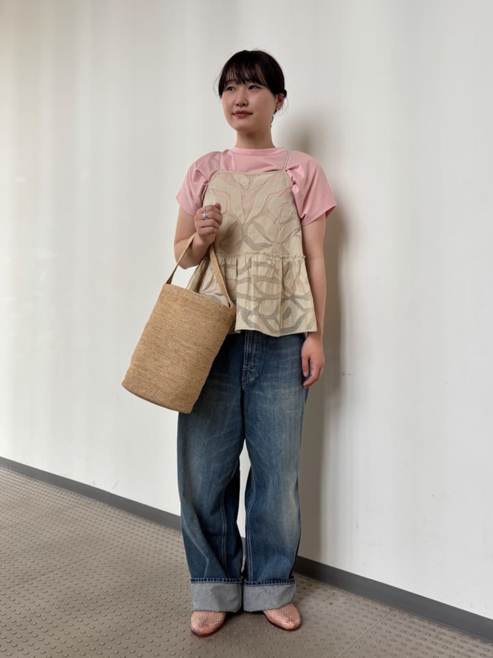 【トップス】 キャミソールは肩紐による調節が可能。体型に合わせて着用していただけます。透け感があり軽い印象になるため、夏の重ね着に嬉しい1着です! 【ボトムス】 ウエストが絞られ、ヒップにかけてゆとりのあるデザイン。フェード感あるブルーデニムは、夏に清涼感を与えてくれます○ 【スタイリングポイント】 インナーと小物の色合わせがポイントです!ピンク色で春らしさを残しつつ、夏に向けたスタイリングに仕上げました。