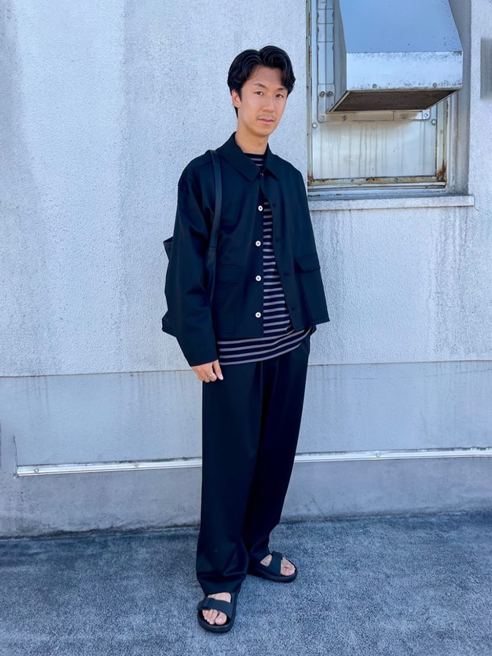 【サイズ感】 トップス:ややゆったり 1番大きいサイズを着用しておりますが、着丈が短くインナーで遊べるデザインです。 ボトムス:ややゆったり 【スタイリングポイント】 ブラックでまとめて綺麗めな雰囲気にしました。 足元はサンダルにし、少し涼しくなってきた季節をイメージしました。