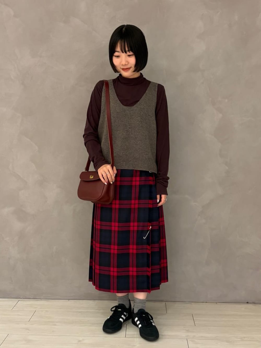 【サイズ感】 インナー:ややタイト ベスト:ゆったり スカート:標準 【スタイリングポイント】 秋らしい配色で大人っぽく合わせてみました。 スカートのチェックとレザーバックでトラッド感もプラスしてみました! 革靴らしく履いていただける、別注のSPEZIALもオススメです^^