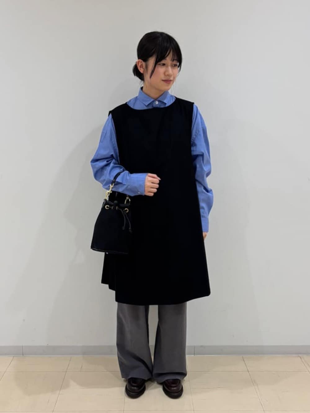 【トップス】 オーバーだけど、綺麗にきまるシャツ。タフなので長く着用していただけます。 ベストは横が大きく開いているので、重たくなりすぎません。小さめの襟が首元からのぞいているのも可愛いです。 【パンツ】 ゆったりしたシルエットで膝下もすらっと。 秋冬にもってこいの色味です。 【小物】 足元はブラウンで少し可愛さを足して、バックを黒にして統一感を出しました。
