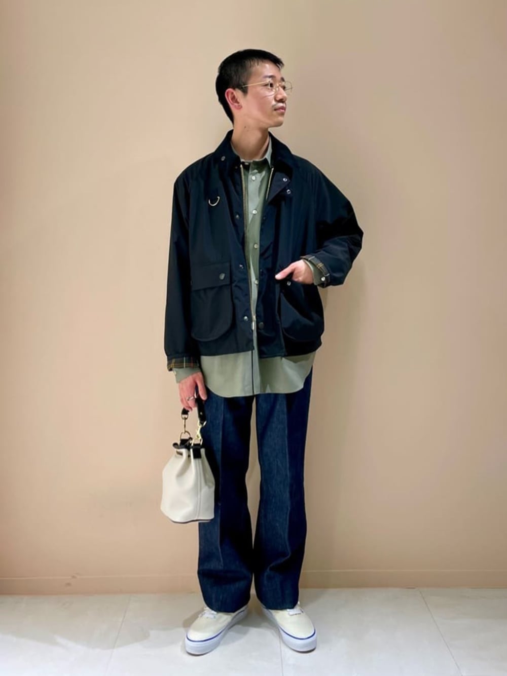 【サイズ感】 ・アウター 身幅にゆとりあり。 別注ポイントで着丈はショート丈。 ・シャツ 全体的にゆとりあり。 ・パンツ 全体的にゆとりあり。 ・シューズ ジャストサイズ。 普段スニーカーで26.0cm着用。 【スタイリングポイント】 別注BarbourのBLYTHのショート丈がいきるようにシャツとレイヤードしました。 袖裏のチェックのオリーブカラーをシャツで拾いました。 小物はあえて白で統一して春らしい軽さを意識しました。
