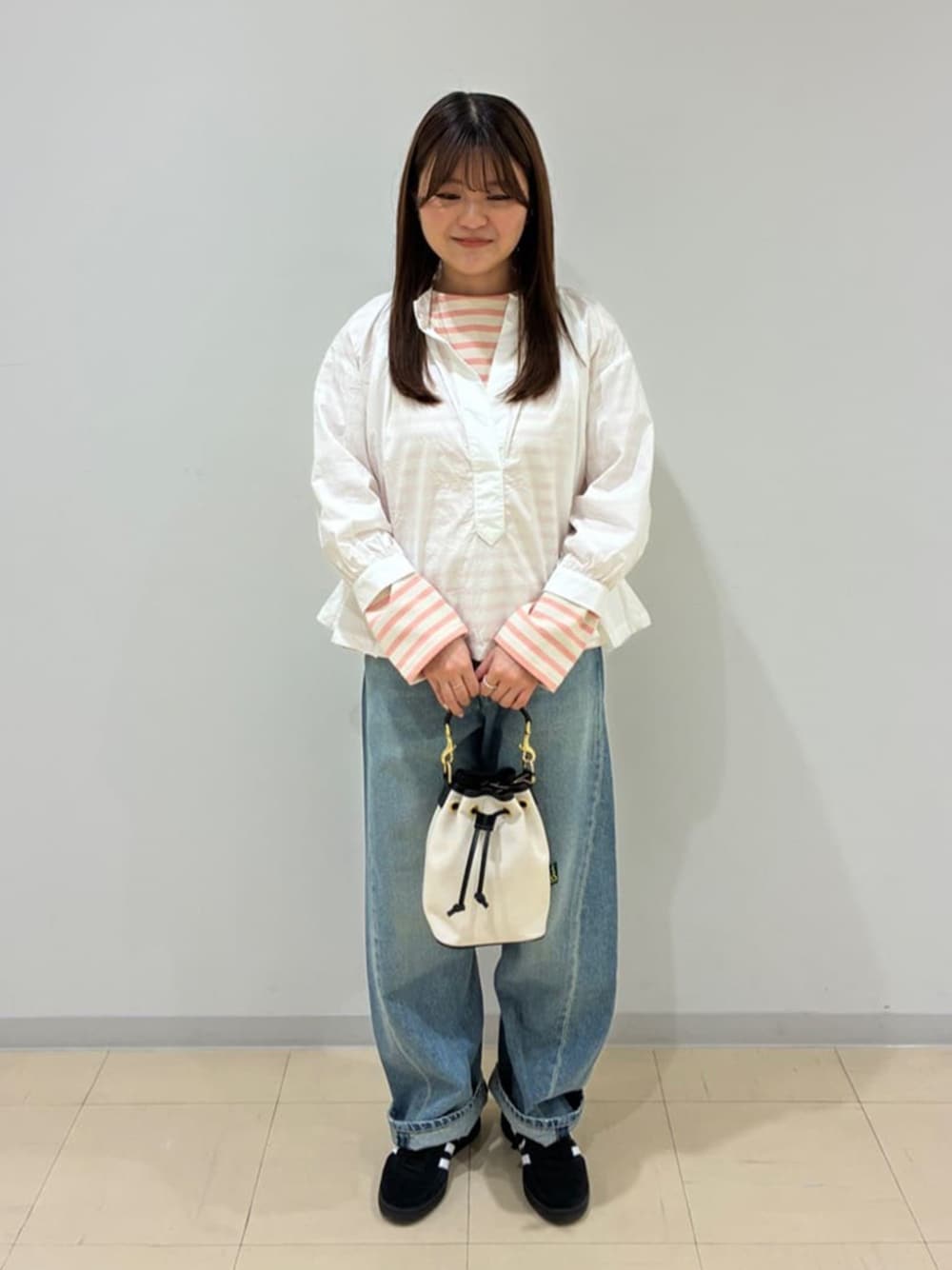・シャツ (GALLEGO DESPORTES) 首回りに一周あるギャザーが可愛らしいです! 程よく透け感もあるので、カラーアイテムや柄物を入れてあげるのがオススメです◎ ・パンツ (SOPHIE TALKS ABOUT THE WEATHER) 2026年春夏から取り扱いスタートした新ブランドです! 程よく色落ちしてあり、低身長でもワンロールで履けました◎ ・バッグ (Brady) 今年の春夏の限定色です! 持っているだけで春らしさが演出できます。 【スタイリングポイント】 ホワイト×ピンクで春らしさを感じられるコーデにしました! ゆったりとしたデニムを合わせることでリラックス感のあるバランスにしています◎ インナーをさりげなく見せることで、コーデにアクセントを加えています。
