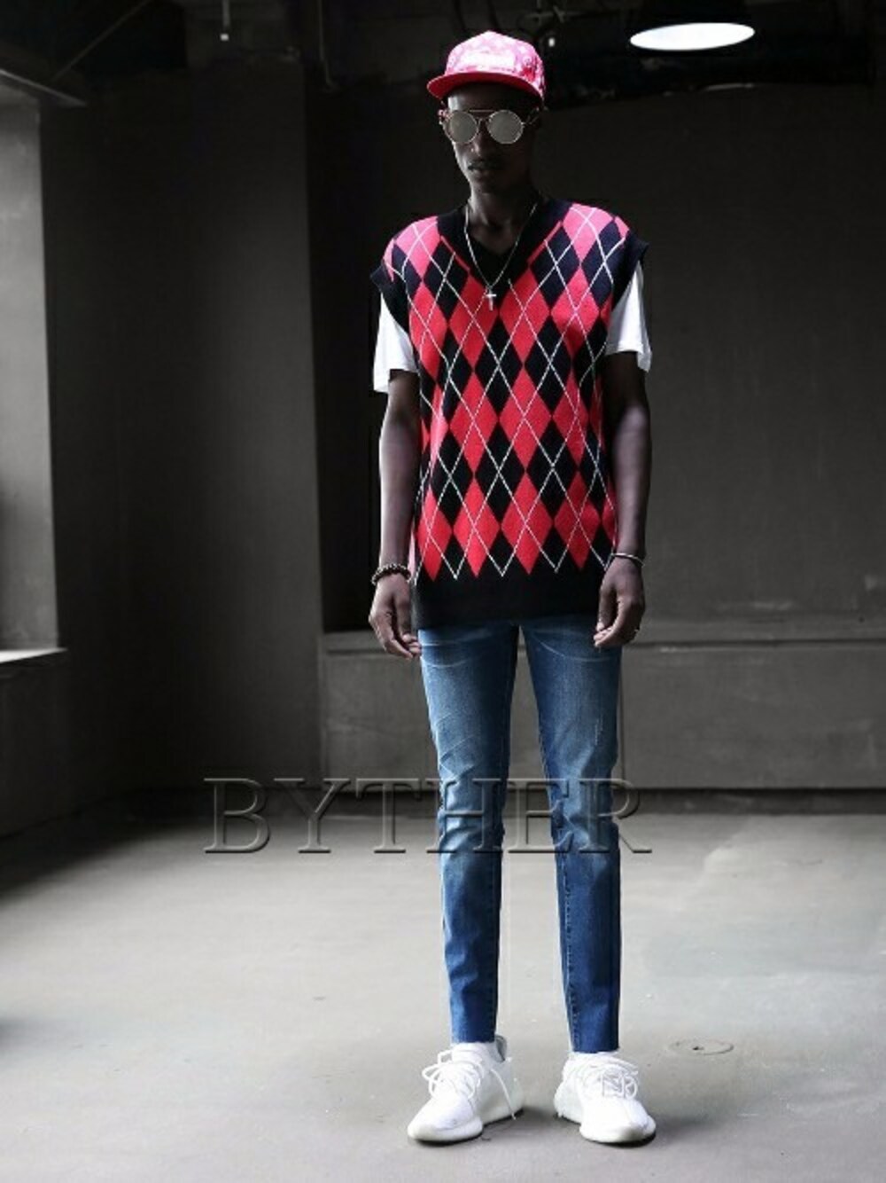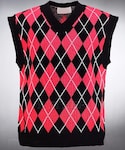 BytheR_JPのベスト「配色アーガイルチェックニットベスト」を使ったコーディネート