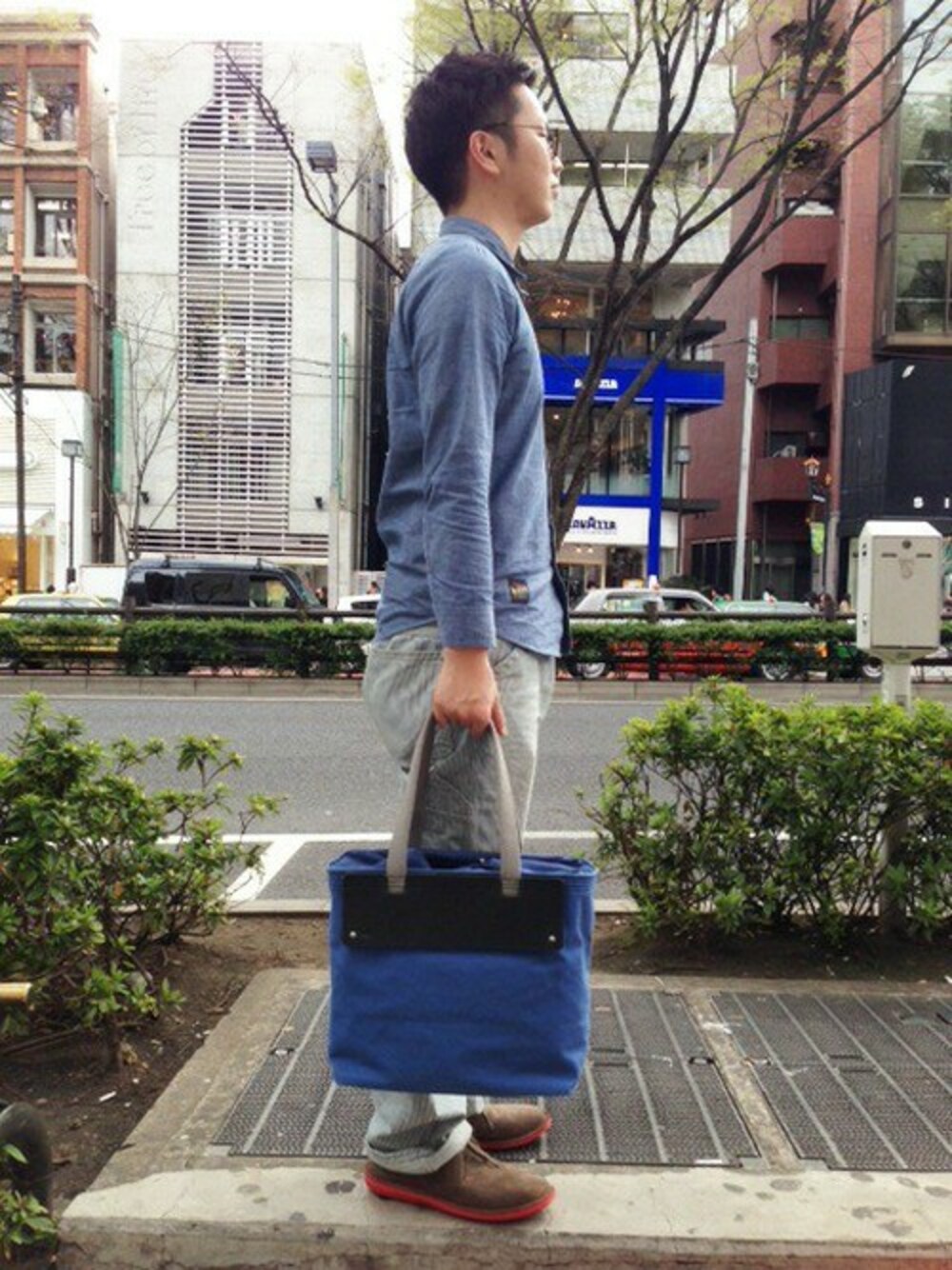 ダンガリーシャツとヒッコリーストライプのワークパンツに合わせてブラウンのスエード製チャッカーシューズと マイク・エーブルソン氏がカンペールのためにデザインしたブルーのトートバッグをコーディネートしました。