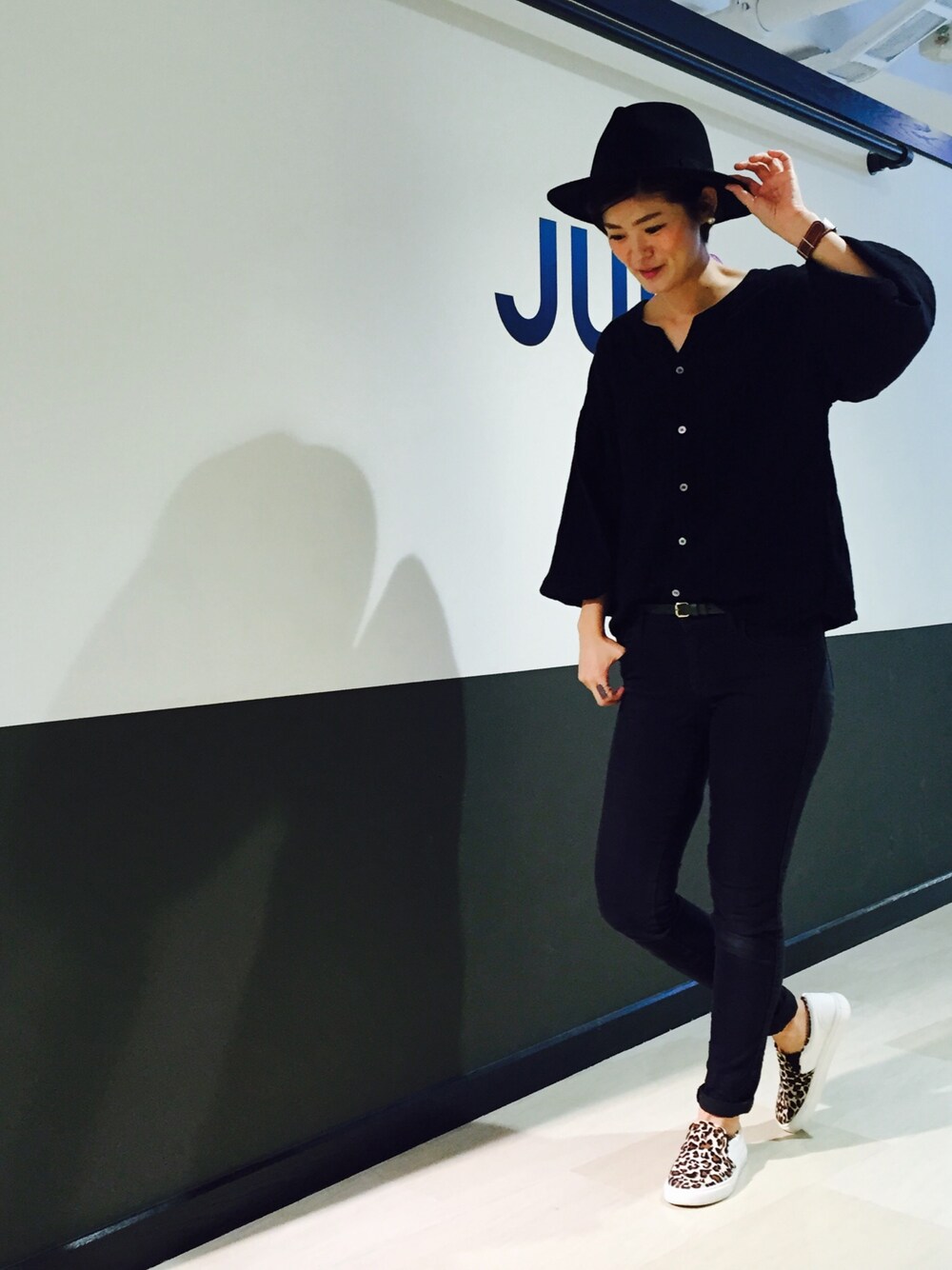 久しぶり、スキニーを履きました!! 鏡見ると、ムチムチ、、、。気にしません! ブラックトーンに足元をレオパード柄にしてポイントにしました^o^ トップスのシャツは今年人気のノーカラーシャツを取り入れてみました!!