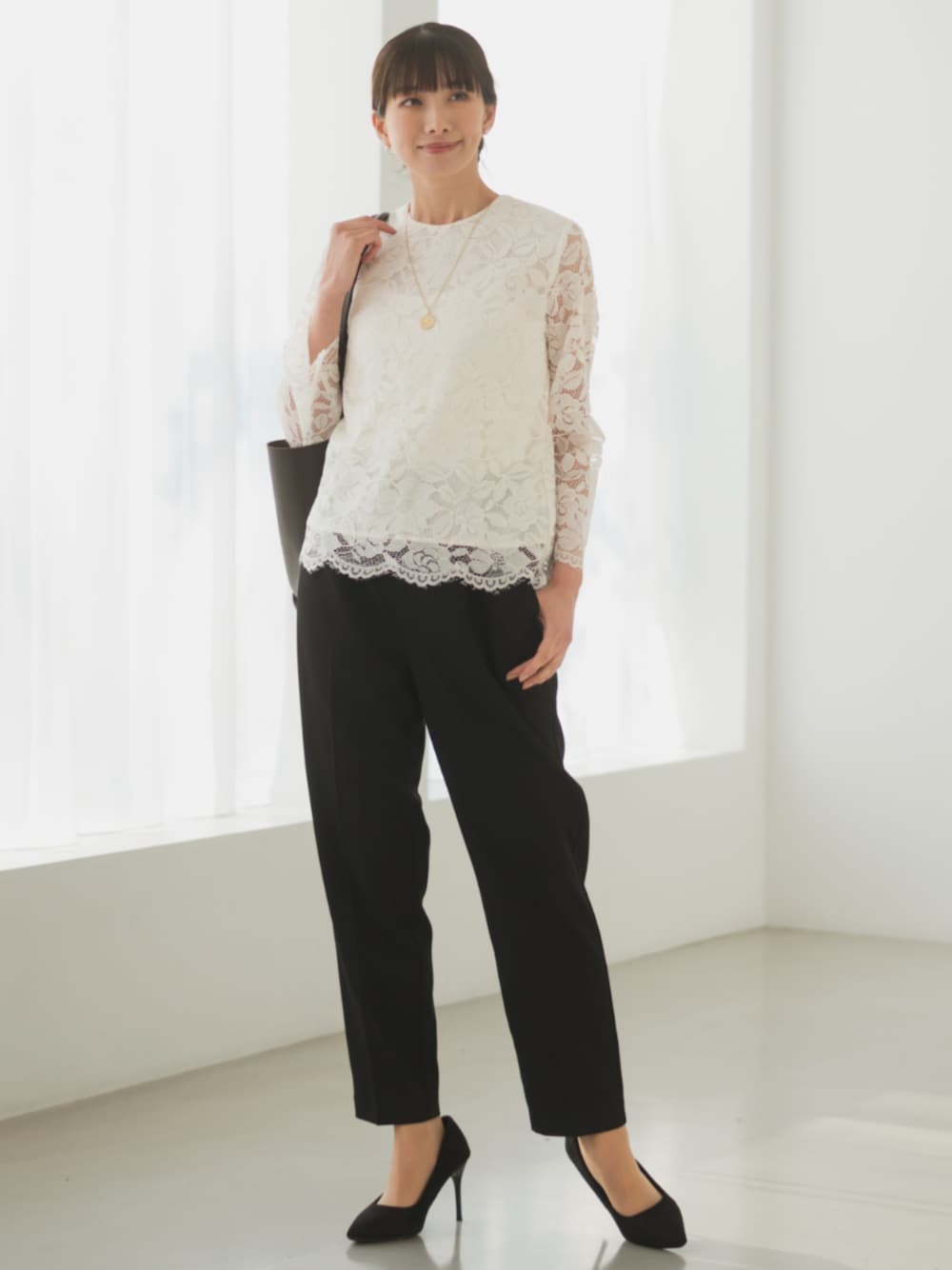 上品なレースブラウスにきっちりと見えるセンタープレスパンツを合わせて、清潔感のあるママコーデ。