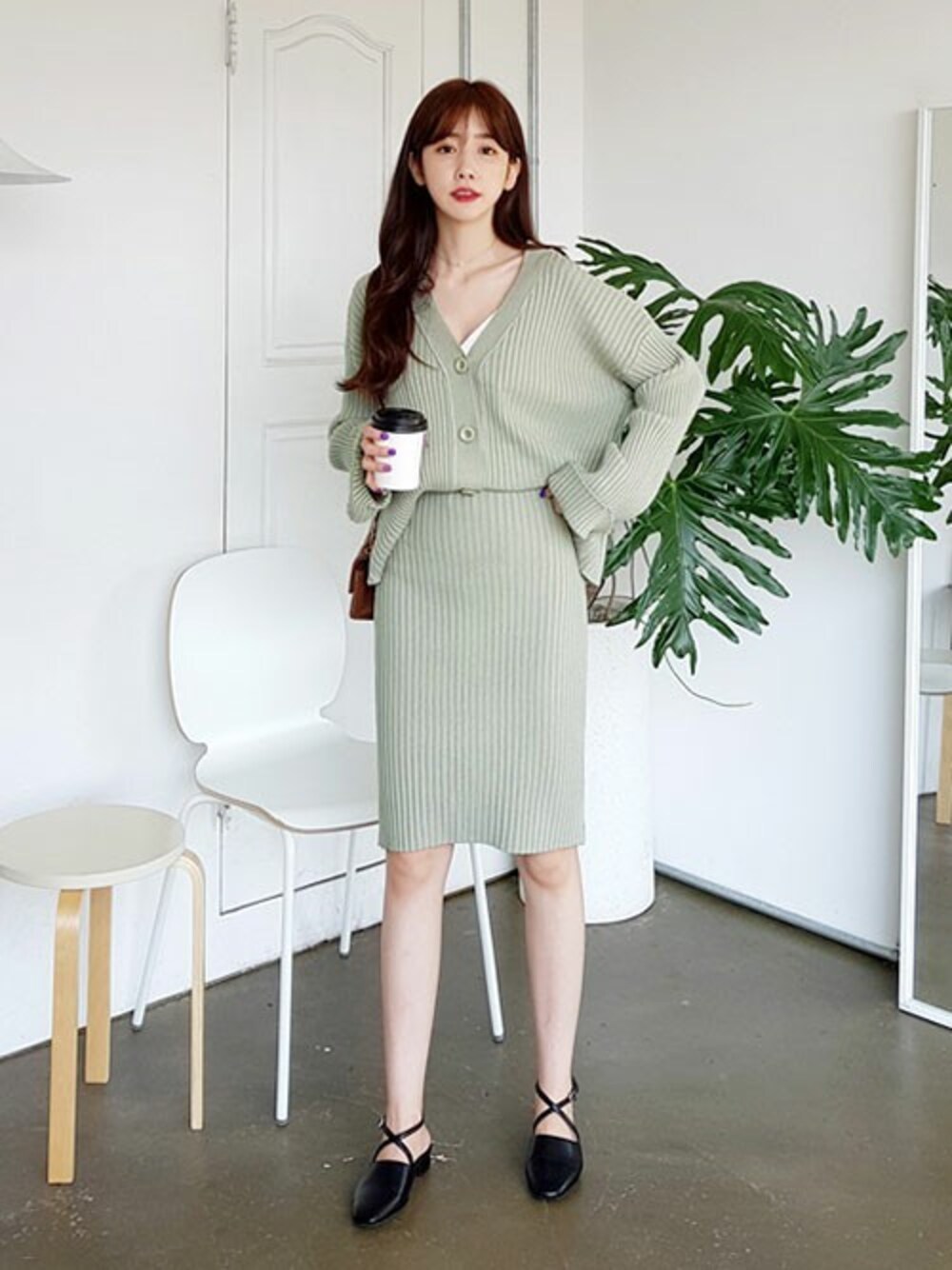 ディーホリックのカーディガン/ボレロ「Vネックリブニットカーディガン&ペンシルスカートSET」を使ったコーディネート
