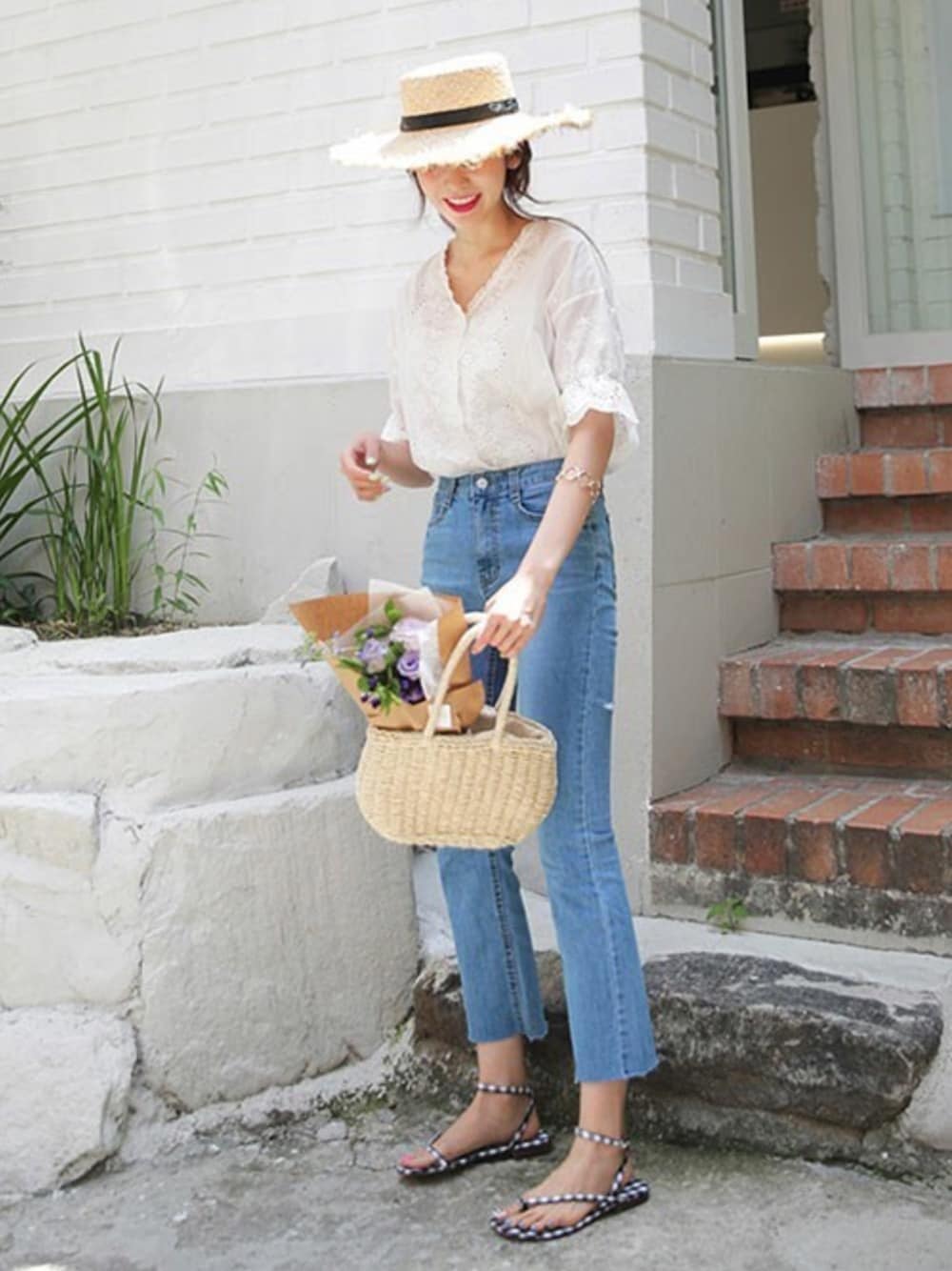 ディーホリックのシャツ/ブラウス「アイレットレースVネックブラウス」を使ったコーディネート