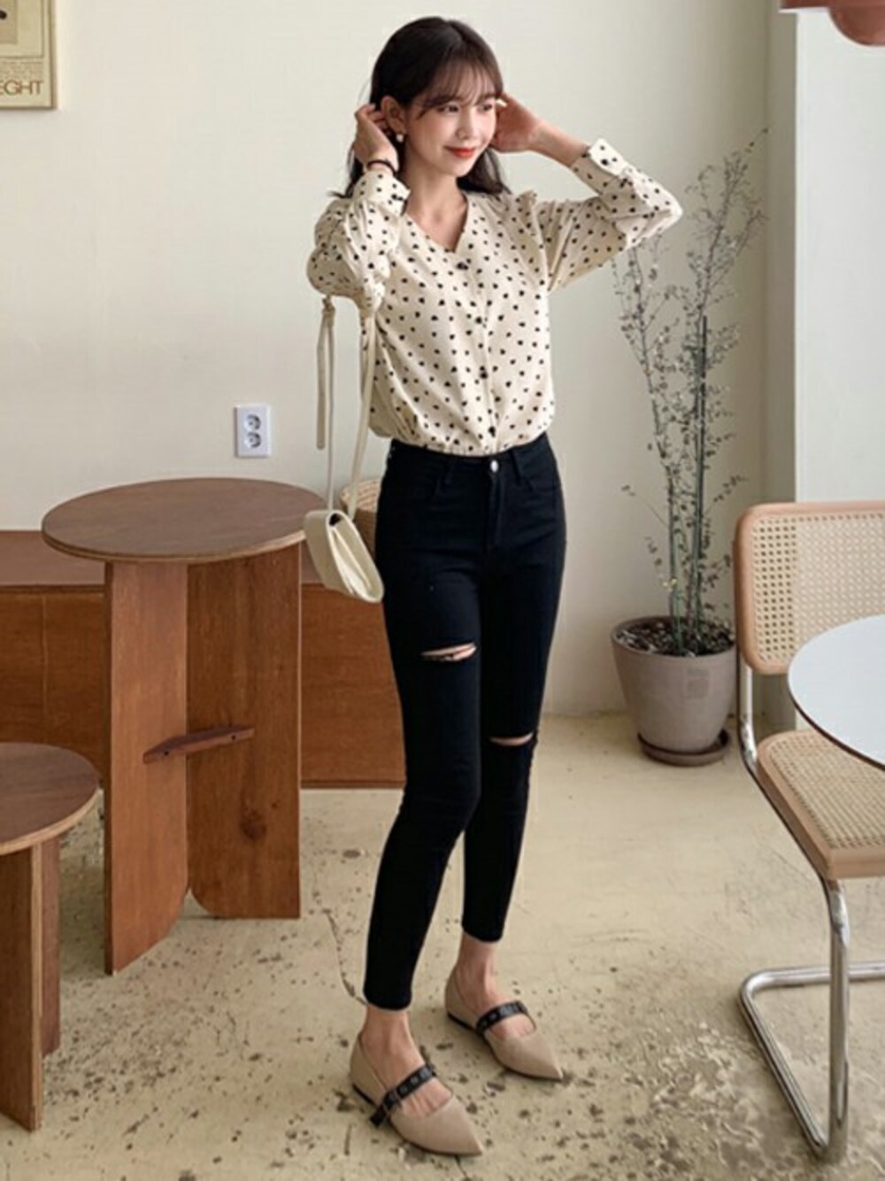 ディーホリックのシャツ/ブラウス「Vネックハートパターンブラウス」を使ったコーディネート