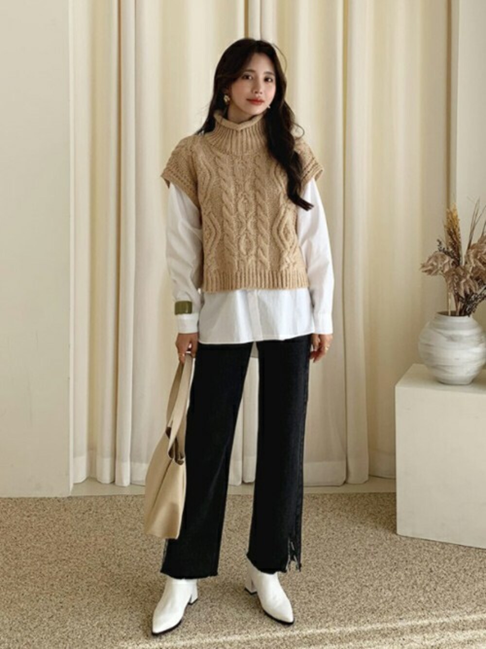 ディーホリックのベスト「ハイネックケーブルニットベスト」を使ったコーディネート