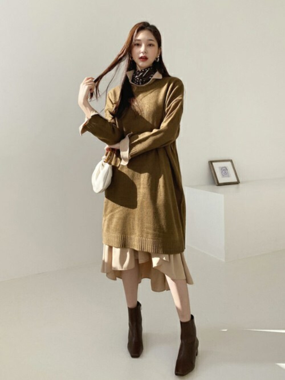 ディーホリックのシャツワンピース「ロングニット&フレアシャツワンピース」を使ったコーディネート