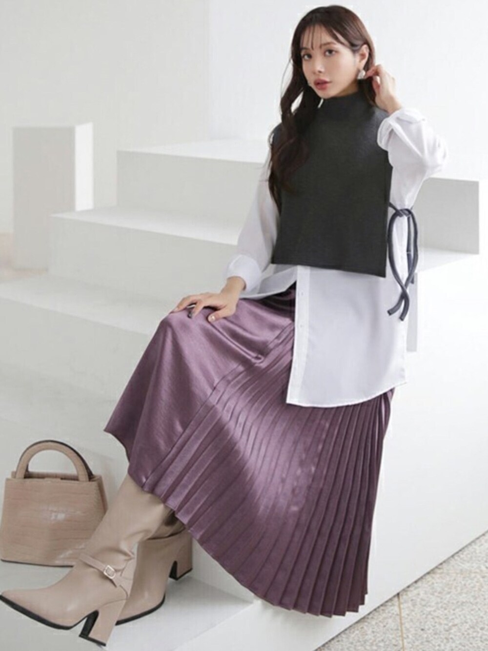 パンツを合わせがちなベストとのレイヤードコーデにはスカートもGOOD サテンの光沢感と珍しいポイントプリーツが目を引きます😍 \ぜひチェックしてください!/ ❤DHOLIC公式SNSアカウント❤ Instagram >>> dholic_official twitter >>> @D_HOLICJP LINE >>> @dholic