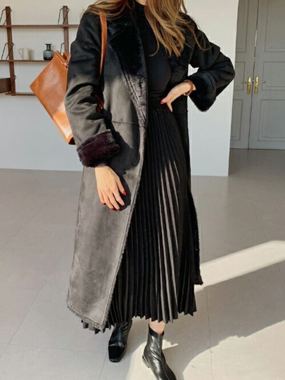 ディーホリックのムートンコート「[ontheriver] エコファーロングムートン風コート」を使ったコーディネート