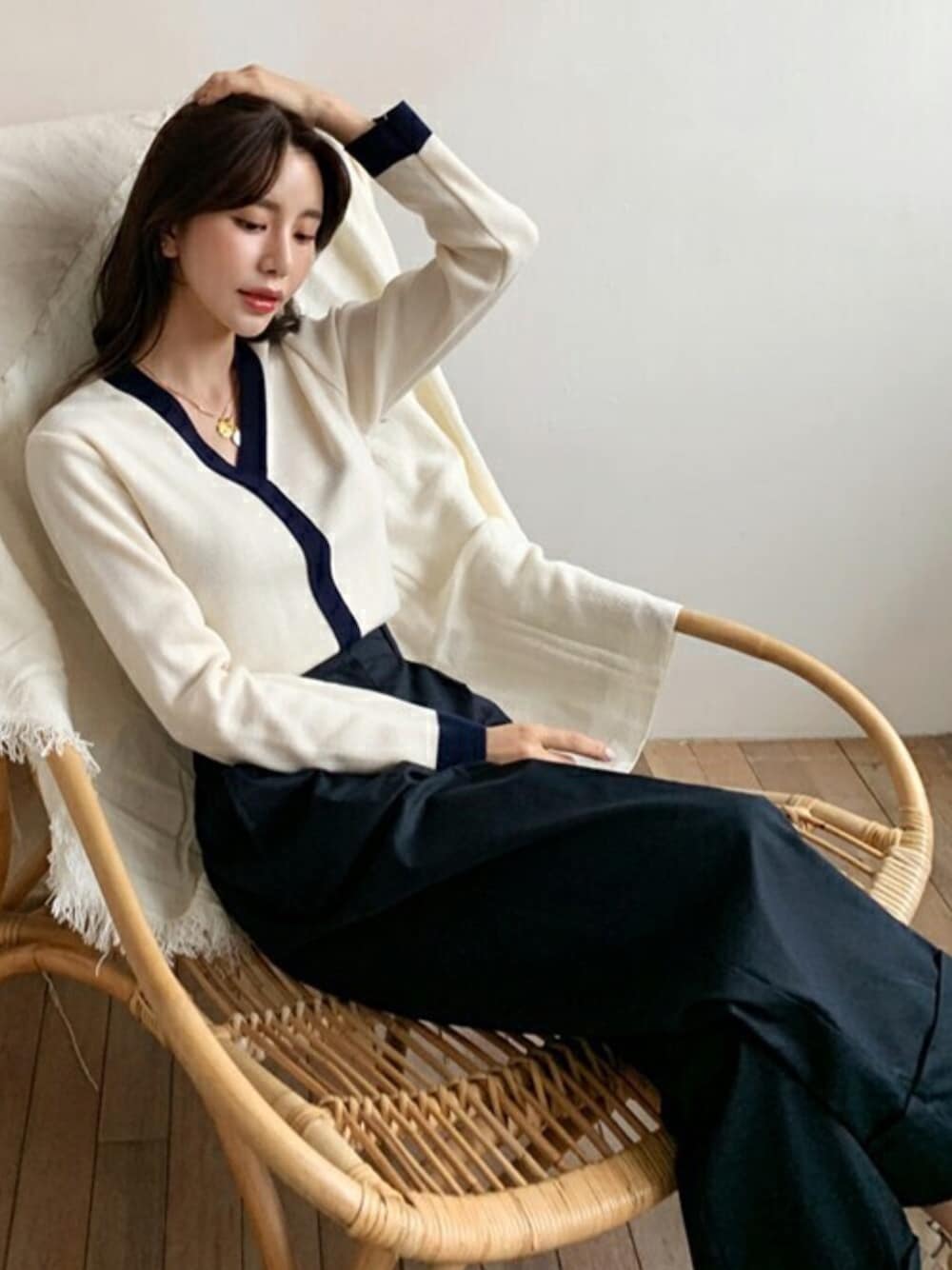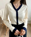 ディーホリックのニット/セーター「配色ラインVネックニット」を使ったコーディネート