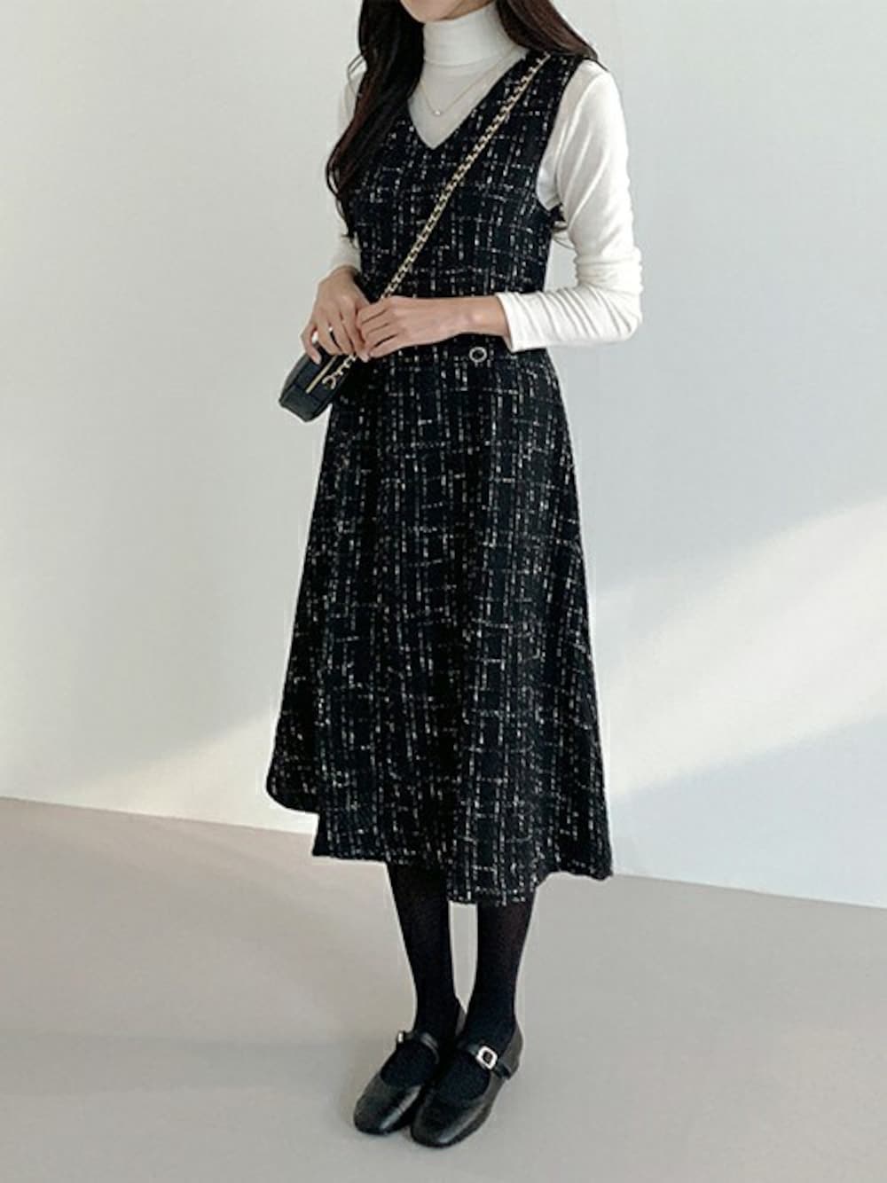 Vネックのツイードワンピースが映えるコーディネート! インナーはピタッとしたアイテムにするとさらにきれい感が増します!