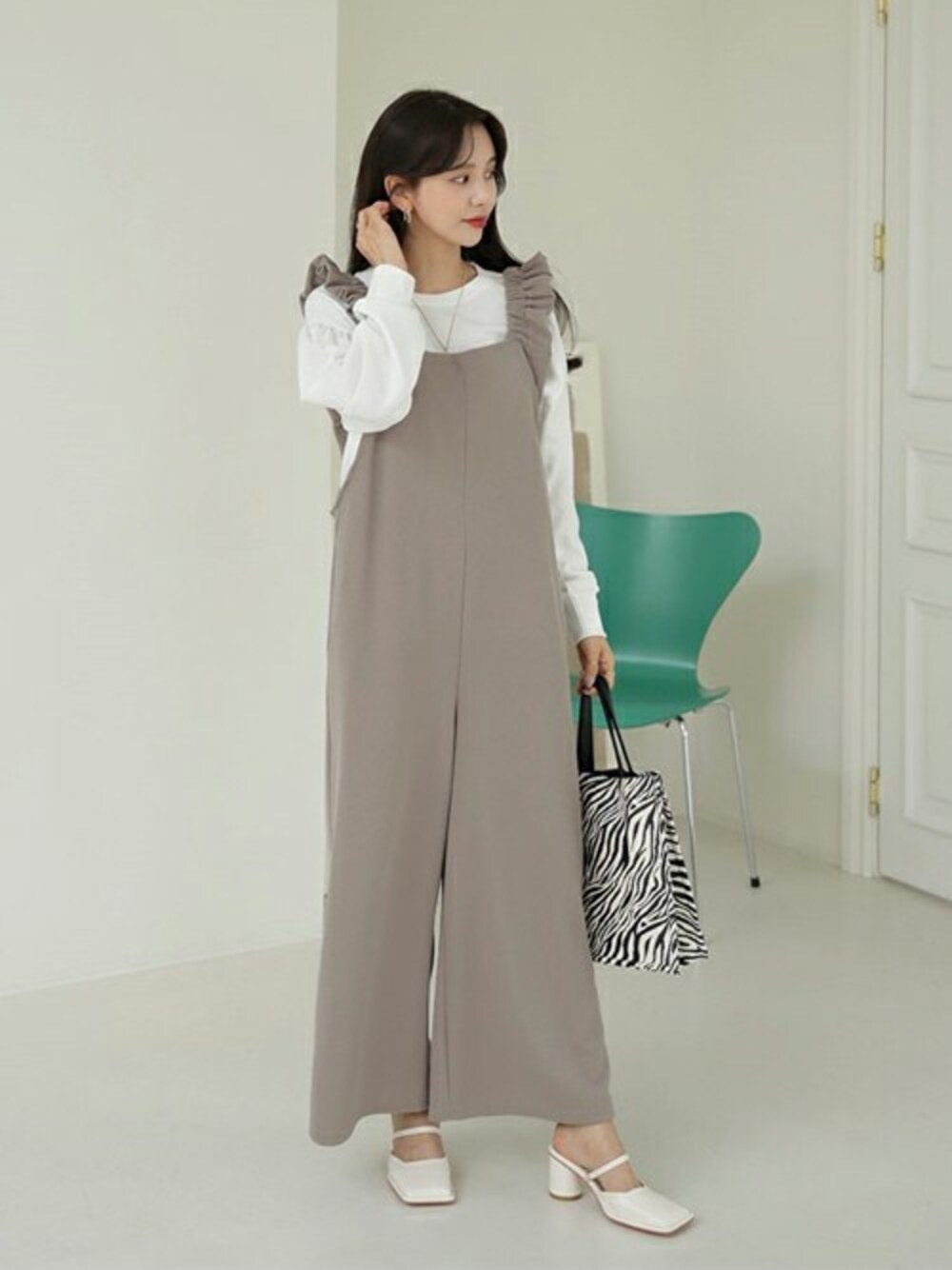 方のフリルがかわいいロンパースがメインのコーディネート。 カジュアル過ぎないように足元はヒール合わせが◎