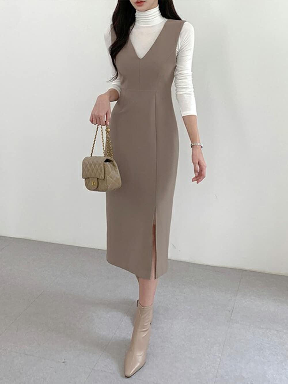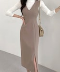 シルエットがきれいなワンピースはピタッとしたインナーを合わせて最大限 自分を活かして。サイドにスリットがあるから歩きやすさも◎