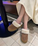 トレンドのムートンサンダルを使ったワンマイルコーデ。 後のストラップは取り外し可能な万能タイプ。