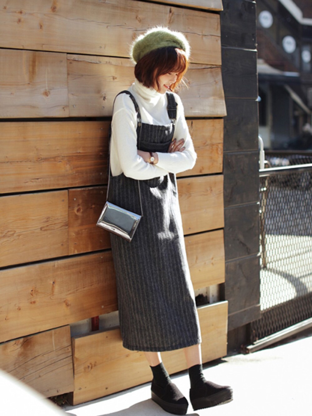 ウール混のジャンパースカートをタートルネックニットとベレー帽でガーリーに仕上げました^^