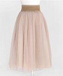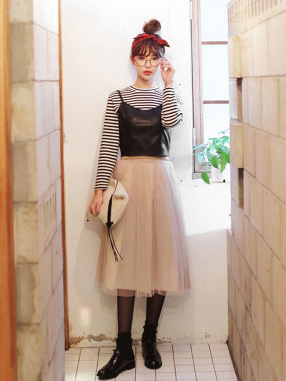ハードな印象のレザー調のビスチェに、チュールスカートとボアのクラッチを合わせてガーリーに。ヘアはアップスタイルでかわいらしく♡